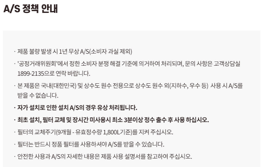 - 필터 교체 주기: 필터는 9개월마다 교체해야 하며, 반드시 정품 필터를 사용해야 A/S 혜택을 받을 수 있습니다.