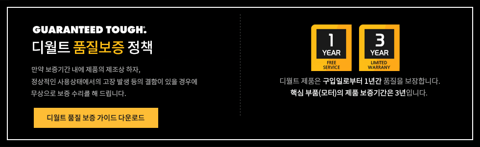 더 자세한 정보가 필요하신 경우, 아래 버튼을 통해 디월트 품질 보증 가이드를 다운로드하실 수 있습니다.